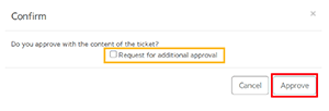 A pop-up screen shows up for approval. If only a single approver is necessary, the approver shall just click “Approve” (indicated in red). If multiple approvals are necessary, the approver shall click on the “Request for additional approval” (indicated in orange) before clicking “Approve”. This process can be done as many times as needed.