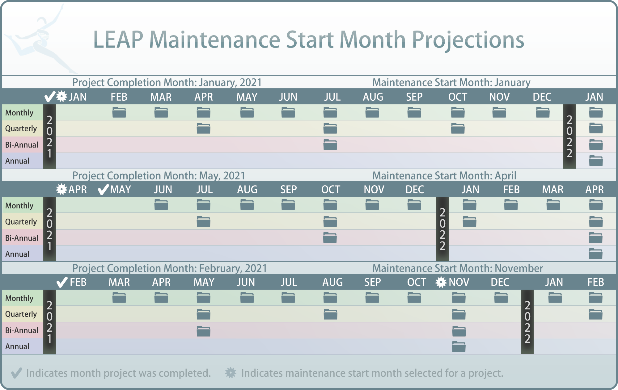 You can edit due dates for maintenance that is in window and not late by using the calendar function, edit maintenance managers and team members from the Maintenance Protocol Setup screen (i.e., Task 4 screen with your customizations saved), and see all uploaded maintenance via the Maintenance Folder. You can also use this Maintenance Folder to upload and request approval for materials. Remember, you cannot edit due dates once the maintenance task is late; even if you complete a late maintenance project, LEAP will keep a record that this maintenance task was late (displayed on the History View). Therefore, you have to keep vigilant about these due dates or your inspector can cite you for delayed maintenance.