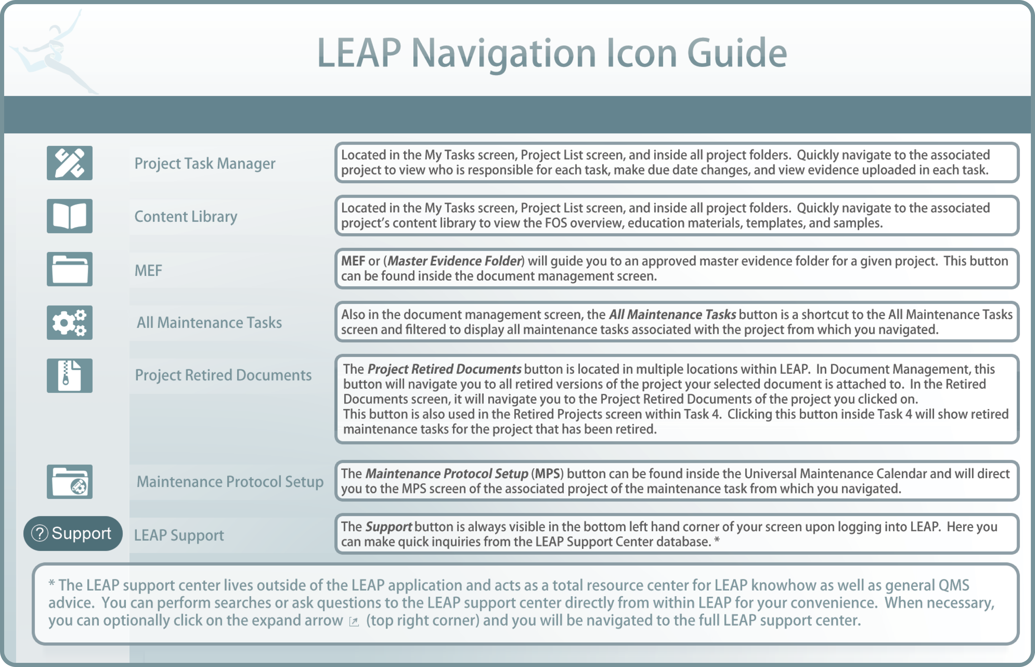 As a LEAP user you will have access to: a) LEAP’s video tutorial library, b) LEAP dictionary, c) Release Notes d) the ZenDesk help center/FAQ page, and a e) QMS consultant. Each of these tools are described below: