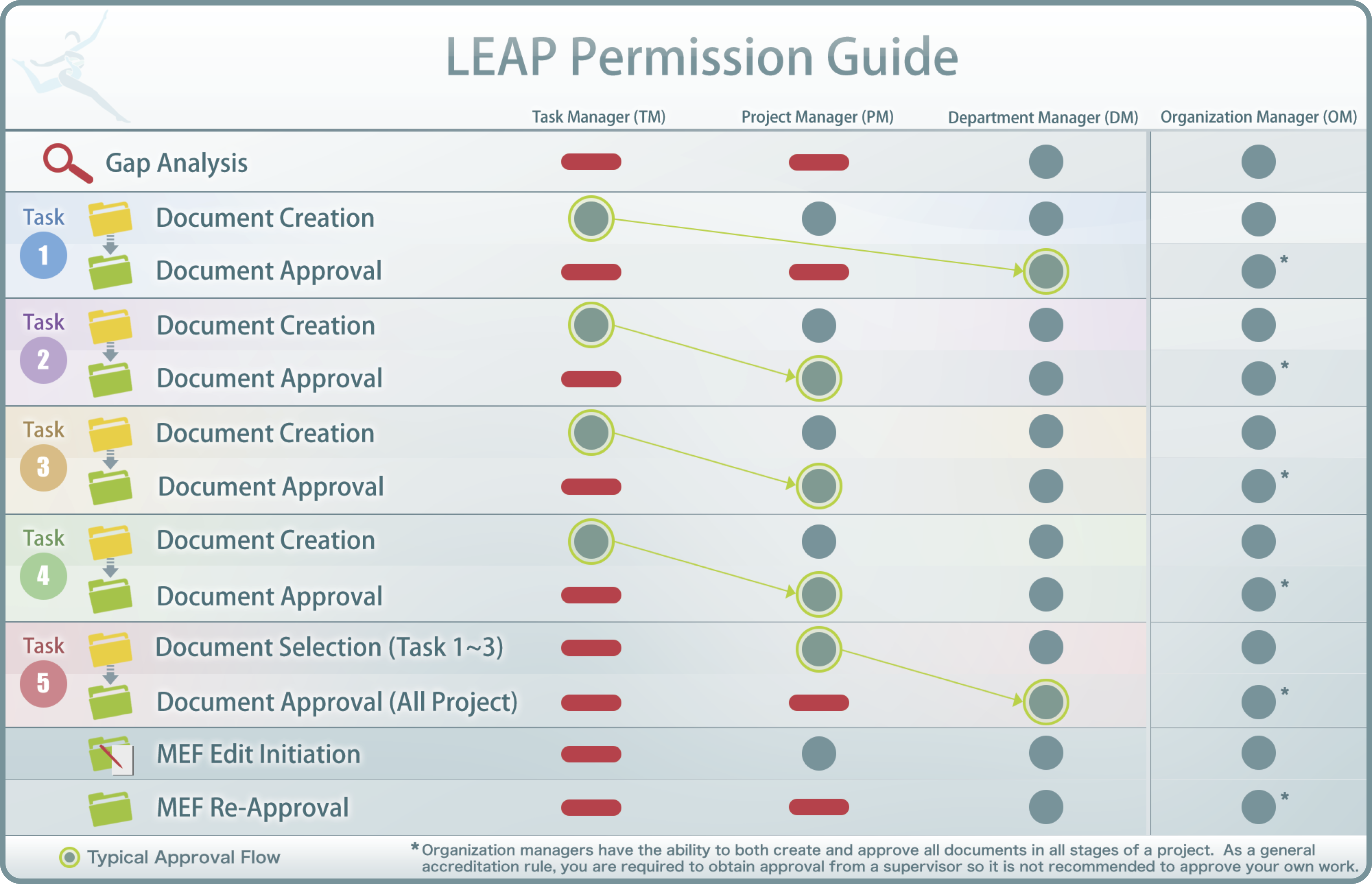 One of the key elements of LEAP is the system of checks and balances we call the approval system. It is the objective of this system to assure the quality and completeness of all aspects of your QMS by having everything checked by two discrete individuals. This system will be employed to confirm evidence in each WEF, MEF, and MF.