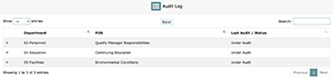 LEAP not only allows you to audit your laboratory and its departments but also keeps a log of each FOS that has been audited. Upon first load of the “Audit Log”, you’ll see each FOS listed next to its relative department along with its most recent audit date. If the FOS in question is currently under audit, that will be denoted in the “Last Audit / Status” column as shown below.