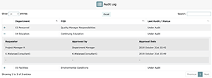In the event you would like to see previous audits of a particular FOS, simply click on the “+” mark and a dropdown menu will appear showing you the audit dates, the user that requested approval of the audited MEF (usually the Project Manager), and the user that approved it (either the Department Manager or Organization Manager).