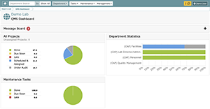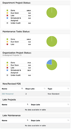 With the completion of each FOS Task 4, you are required to assign managers to maintain the projects standards and their associated maintenance. A quick look at your laboratory’s overall maintenance status is shown on the QMS Dashboard which also displays a list of projects that contain late maintenance tasks. Department Dashboards also show a department-level, overall status pie chart and a list of projects that contain late maintenance tasks within the given department.
