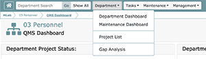 Only Accessible from a Department Dashboard is the Department Menu. This menu allows access to the following screens. Note that navigation to other dashboards which can be accessed from the QMS dashboard (e.g., My Tasks, My Document Reviews, etc.) remains possible even after you access the Department Dashboard. The only new aspect of the navigation is the Department Menu.