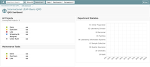 QMS Dashboard: View QMS Project and QMS Maintenance status for the entire laboratory and all departments in a single place. New standards, late projects, and late maintenance are also prominently displayed.Below is an example of the primary QMS dashboard.