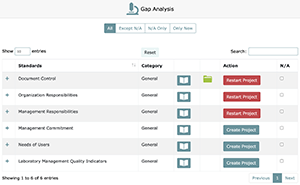 Once you have completed either a new gap analysis or self-audit on your project, the project will no longer appear in the aforementioned New/Revised FOS list on your QMS Dashboard, and your laboratory will be in full compliance with the latest standards associated to the chosen accrediting body. Note that, unless otherwise notified by the respective accrediting body, your laboratory has a full year to implement changes in accordance with these new/revised standards.