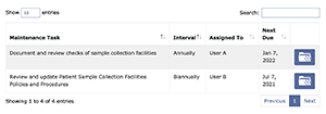 The project maintenance screen will give you an overview of the selected project’s maintenance tasks, their assigned intervals, to whom each task is assigned to, and the due date for each tasks’ next interval.
