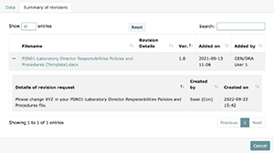 You can also select one or more files in the document management screen by clicking on the check box on the left column to either download the documents themselves in bulk or download a list of these documents with the above information (basically creating a list of controlled documents). To download individual files, simply click on the file name of the desired file.