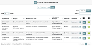 From the maintenance menu, it is possible to view maintenance tasks across the entire laboratory by clicking on Universal Maintenance Calendar. Here you can see all maintenance tasks for all departments. While this view is also possible by clicking on All Maintenance Tasks (if you do not select a department), the Universal Maintenance Calendar has additional features built in.